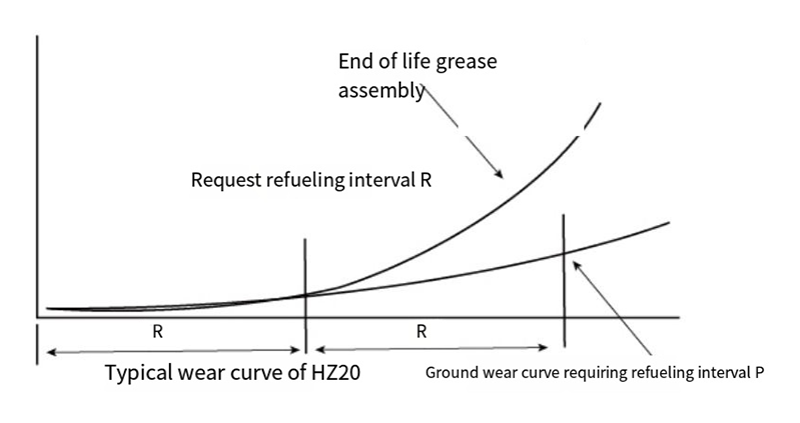 HZ20-material följer speciella slitageregler som visas i Fig.4, oändligt liten nötning kan uppstå i R-fas när det appliceras med fett och sedan installeras. Men efter R-fasen. gränssmörjningsvillkoret kommer att försvinna och slitaget blir överdrivet. Om du fyller på med olja. produkten kan drastiskt hållas av icke-anmärkningsvärd slitage och dess livslängd kommer också att förlängas avsevärt. Därför är fördelen med HZ20-material att olja ska tillsättas med en